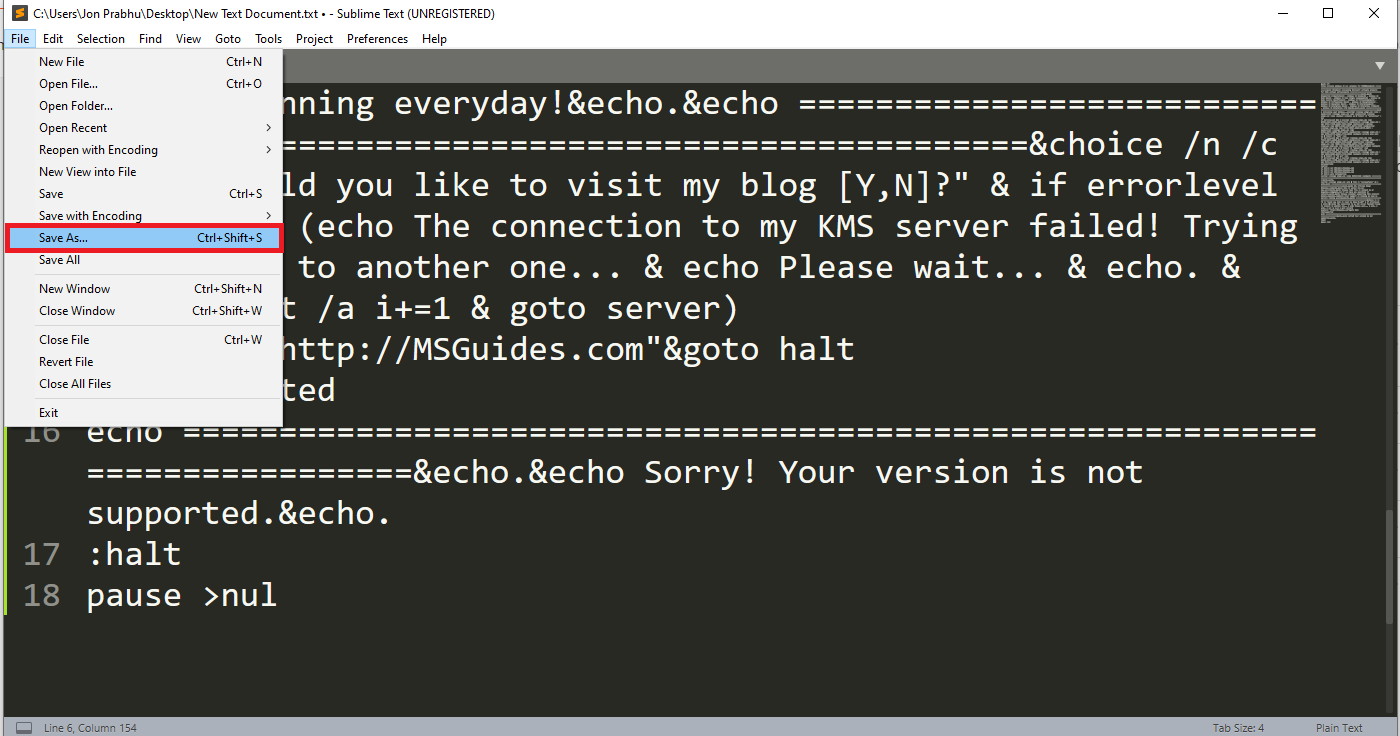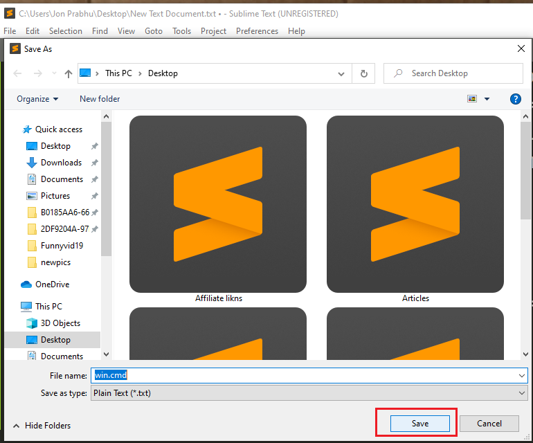 Step 2: Create a New Text Document file, paste the code, and save it as 'win.cmd' (batch file)