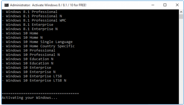 title Activate Windows 10 ALL versions for FREE!&cls&echo ============================================================================&echo #Project: Activating Microsoft software products for FREE without software&echo ============================================================================&echo.&echo #Supported products:&echo - Windows 10 Home&echo - Windows 10 Home N&echo - Windows 10 Home Single Language&echo - Windows 10 Home Country Specific&echo - Windows 10 Professional&echo - Windows 10 Professional N&echo - Windows 10 Education&echo - Windows 10 Education N&echo - Windows 10 Enterprise&echo - Windows 10 Enterprise N&echo - Windows 10 Enterprise LTSB&echo - Windows 10 Enterprise LTSB N&echo.&echo.&echo ============================================================================&echo Activating your Windows...&cscript //nologo slmgr.vbs /ckms >nul&cscript //nologo slmgr.vbs /upk >nul&cscript //nologo slmgr.vbs /cpky >nul&set i=1&wmic os | findstr /I "enterprise" >nul