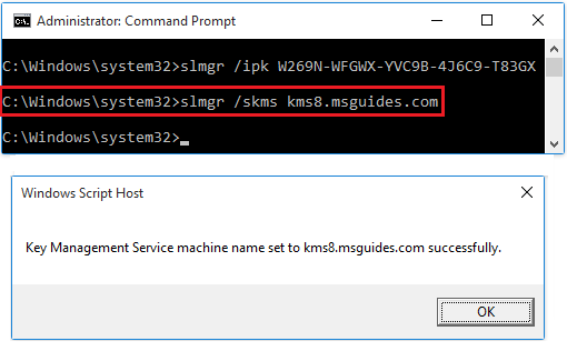 Step 4: Type, slmgr /skms kms8.msguides.com and hit Enter.