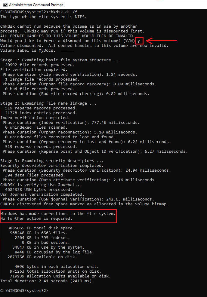 Step 2: Type chkdsk d: /f and hit Enter.