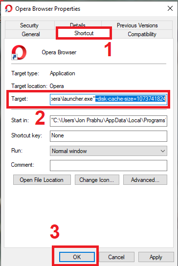Step 2: Go to Shortcut tab. In the target field, copy + paste --disk-cache-size=1073741824 at the end of the text and click ok.