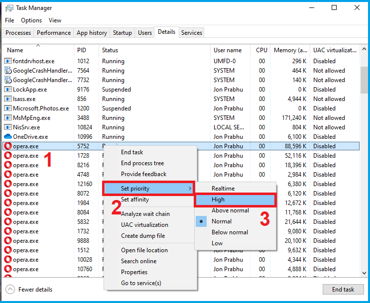 Step 2: Right click on your specific program, choose Set priority and click on High or Above normal depending on your usage priority.