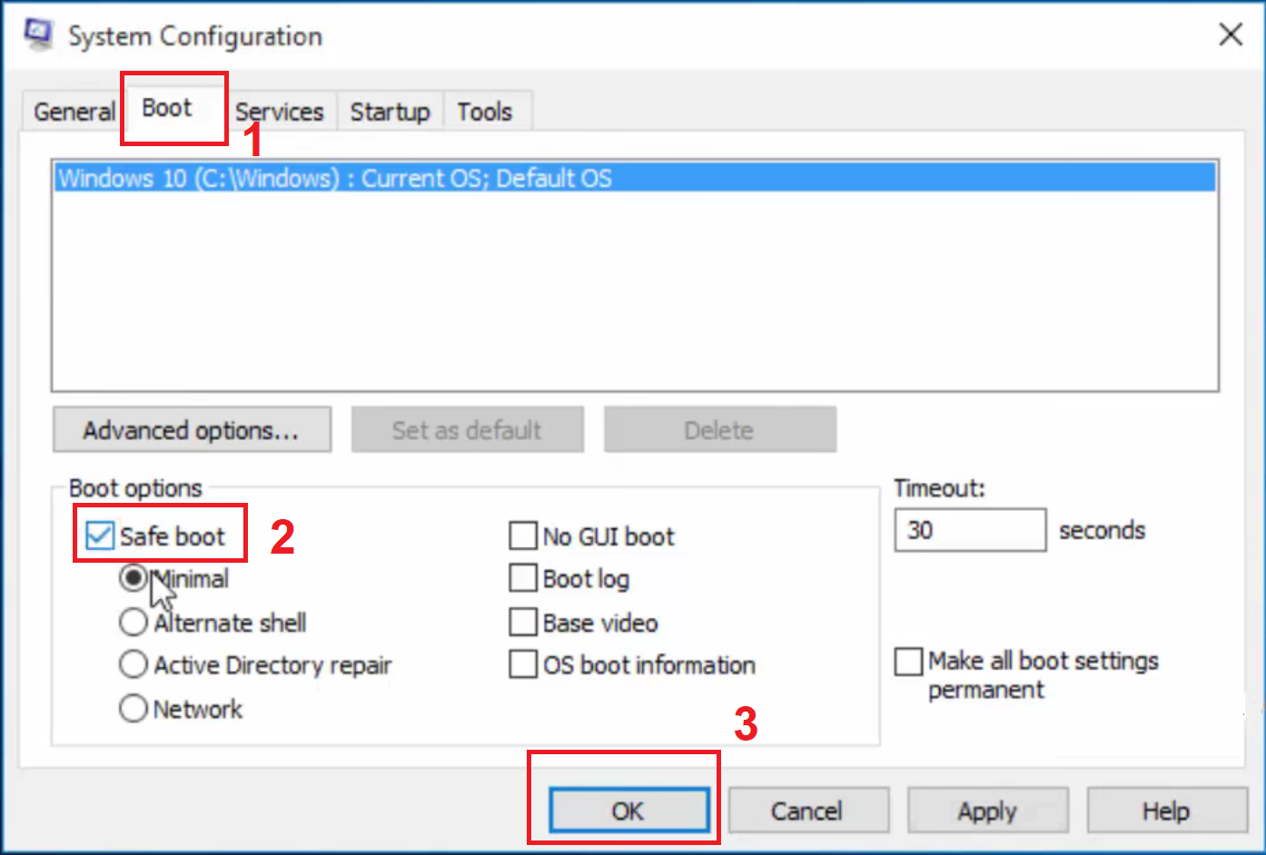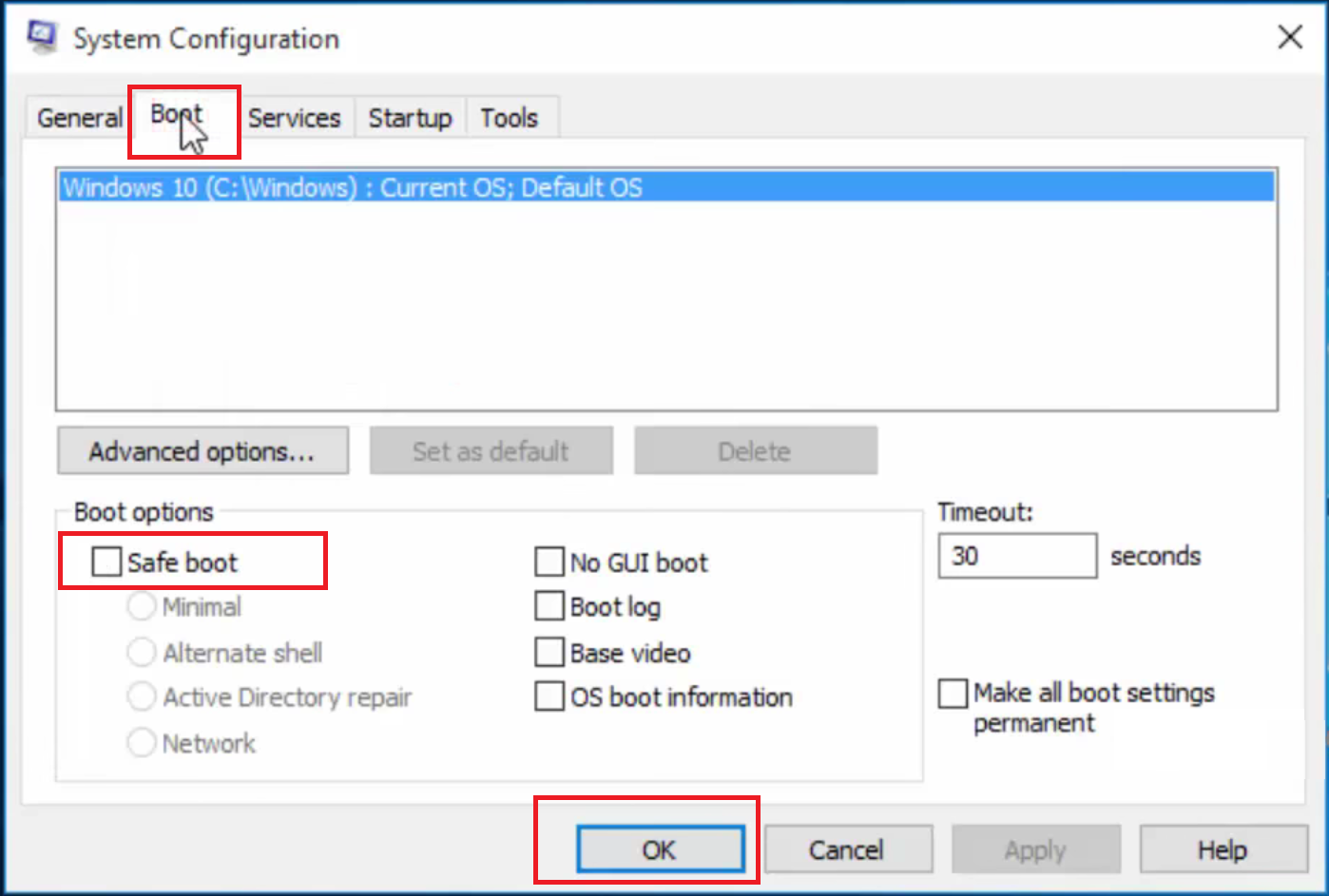 Step 2: Under Boot tab, check for Safe boot and click OK and further click on Restart.